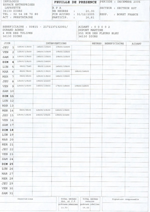 La feuille de présence est le document de collecte des heures effectuées par l'aidant chez l'aidé. Elle peut être produite avec indication des plages d'interventions sur le mois (exemple ci-dessus).