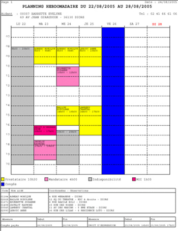 Edition à la semaine ou au mois, en individuel ou en collectif avec détail des coordonnées des aidés, des absences et des plages de nuit.